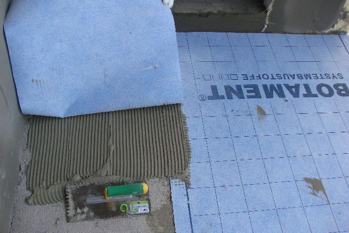 W następnych krokach powinniśmy zagruntować przygotowaną wcześniej warstwę spadkową. Możemy do tego użyć sprawdzonego środka, jakim jest BOTAMENT® D 11. Teraz możemy zabrać się za zabezpieczenie najbardziej problematycznych elementów balkonu lub tarasu – połączenia z nisko osadzonymi oknami lub drzwiami warto wykonać przy pomocy taśmy uszczelniającej BOTAMENT® Portalband, natomiast narożniki wewnętrzne można również zabezpieczyć taśmą BOTAMENT® SB 78. Powierzchnię tarasu lub balkonu przeciwwodnie zabezpieczamy układając matę uszczelniająco-kompresującą BOTAMENT® AE za pomocą zaprawy klejowej BOTAMENT M 21 (M 21 HP) lub BOTAMENT M 10 Speed. W połączeniu z szybkowiążącą zaprawą klejową BOTAMENT® M 10 Speed możliwe jest układanie płytek już po około 90 minutach od przyklejenia maty nawet przy temperaturze obróbki +3oC – to rozwiązanie szczególnie zalecane jest wczesną wiosną oraz późną jesienią.