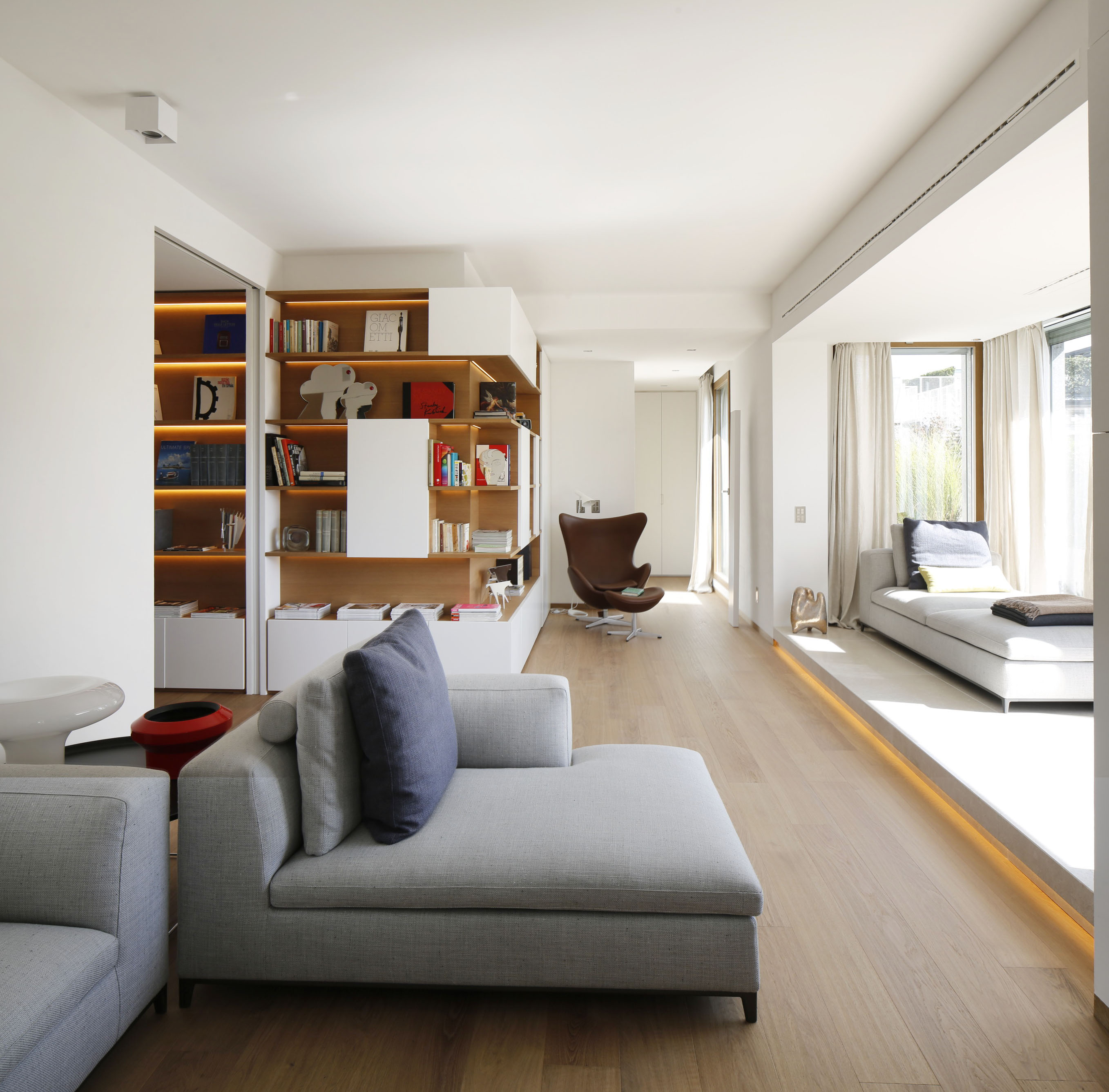 Powierzchnie ścian pokryte naturalnym wapnem są nieprzezroczystne, miękkie i aksamitne w dotyku. Ta nieskazitelna ścienna biel idealnie komponuje się ze stylową podłogą drewnianą Heritage traccia Civita z kolekcji Atelier od Listone Giordano. Dzięki wykończeniu Invisible Touch Fibramix lakierowany dąb francuski w jasnej tonacji przypomina w wyglądzie i w dotyku podłogę olejowaną. Na specjalne życzenie projektanta zachwyconego techniką strugania desek starymi metodami, powstały również listwy na bazie desek parkietowych. To szlachetne drewno, pokrywające równomiernie całą poziomą powierzchnię, nadaje przestrzeni mieszkalnej nowoczesnego, a zarazem ciepłego klimatu.