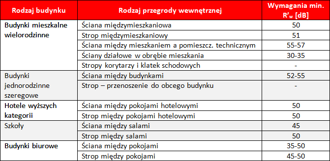 Wymagania szczegółowe w zakresie ochrony przed hałasem w budownictwie prezentuje poniższa tabela: