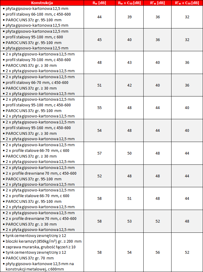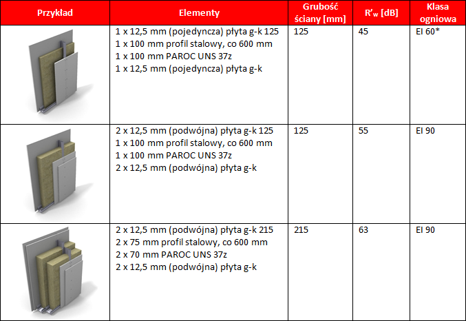 W poniższej tabeli podano kilka przykładów efektywnych rozwiązań konstrukcyjnych z uwzględnieniem wysokich, średnich i niskich wymagań akustycznych, zgodnie z Europejską Aprobatą Techniczną ETA-07-0071. Do wypełnienia ścian działowych w poniższych przykładach użyta została płyta z wełny kamiennej PAROC UNS 37.
