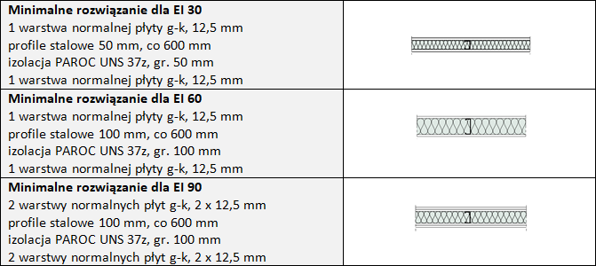 Przykładowo, aby spełnić wymagania odporności ogniowej EI 60 lub EI 90, ściana działowa powinna mieć następującą konstrukcję: