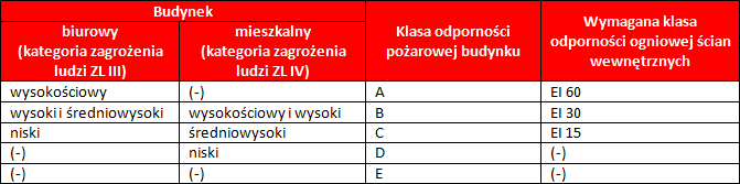 Wymagane klasy odporności ogniowej dla ścian wewnętrznych:
