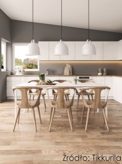 Prostota i oszczędność dekoracji tworzą stylistykę nowoczesnej kuchni. Klimat nieformalnej elegancji można stworzyć łącząc białe meble z szarymi ścianami w odcieniu l487, pomalowanymi farbą odporną na zabrudzenia - Tikkurila Optiva Semi Matt 20. Wprowadzenie silnego akcentu z jasnego drewna na podłodze, a także w dodatkach w formie oryginalnego drewnianego krzesła i blatu kuchennego, ociepli wystrój, zapewniając przytulną atmosferę i dodatkowo rozświetli pomieszczenie.