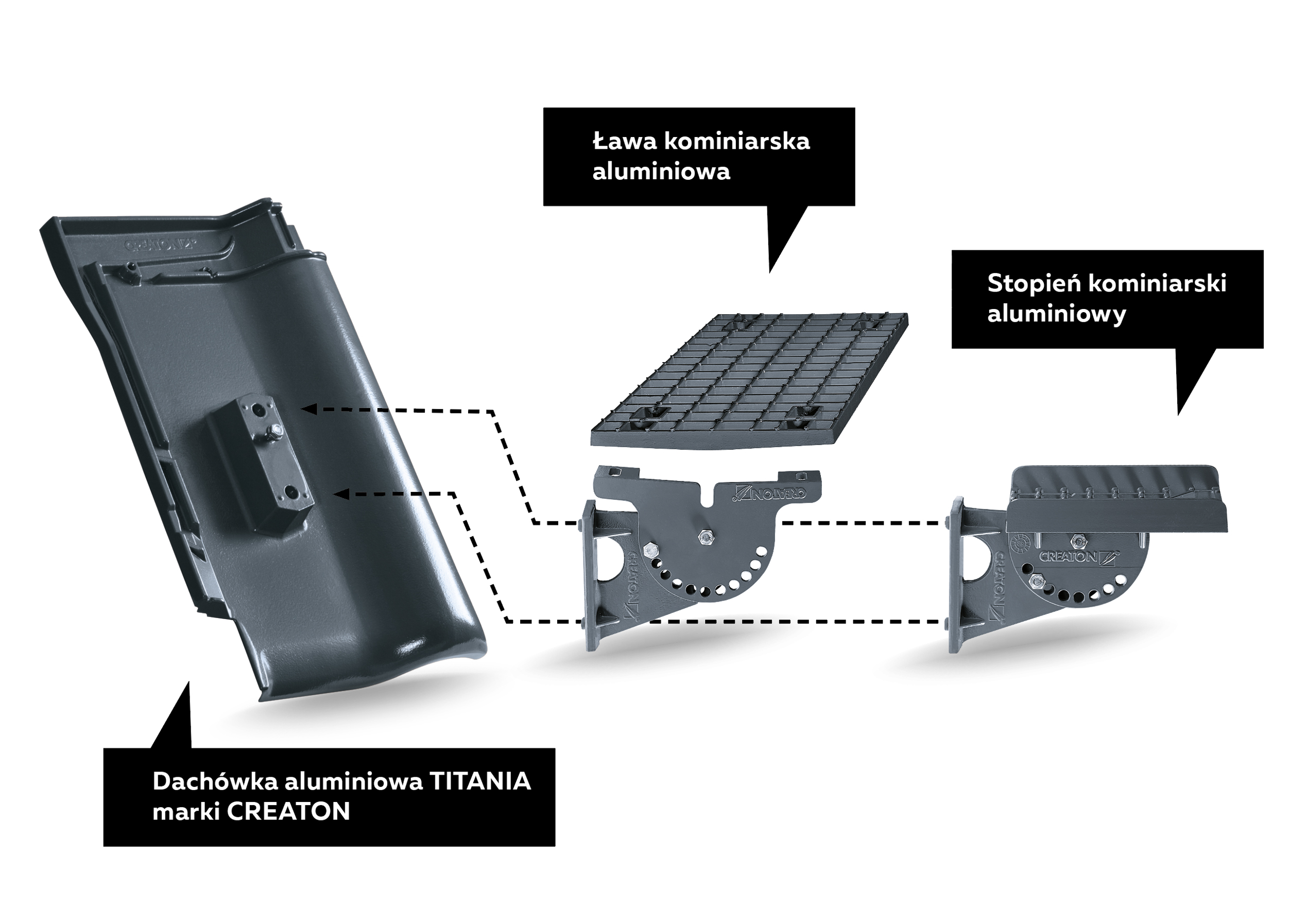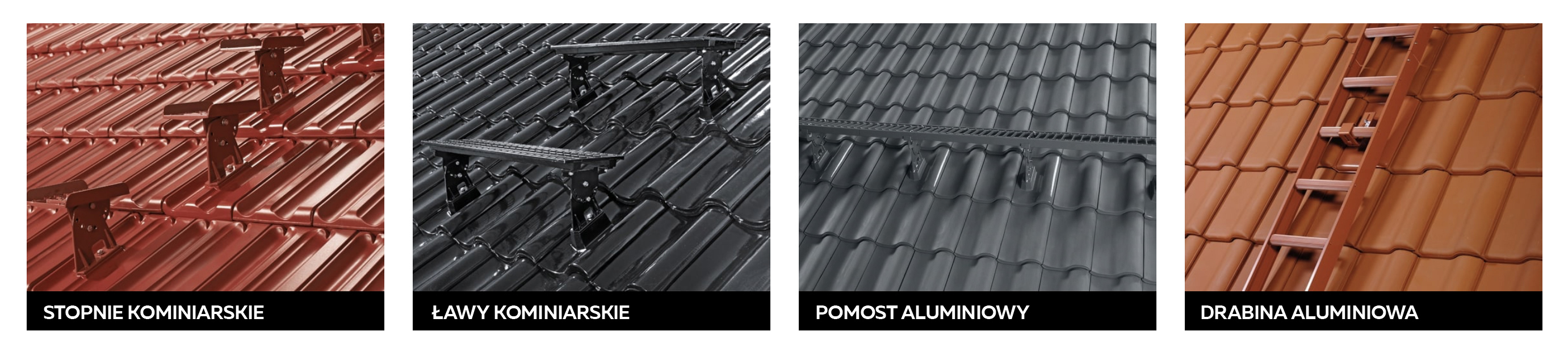 - systemowe dachówki bazowe – dostępne w kompletnych systemach komunikacji dachowej oferowanych przez renowowanych producentów, na przykład lidera rynku dachówek ceramicznych, markę CREATON. Jest to produkt łudząco podobny do właściwych dachówek z danej serii, wyposażony w specjalne uchwyty. Wykorzystuje się je do montowania zabezpieczeń przeciwśniegowych, pod stopnie ławy kominiarskiej oraz do wsporników pod instalacje OZE. Do pokryć cementowych dedykowane są dachówki z tego samego materiału a do ceramicznych z aluminium.