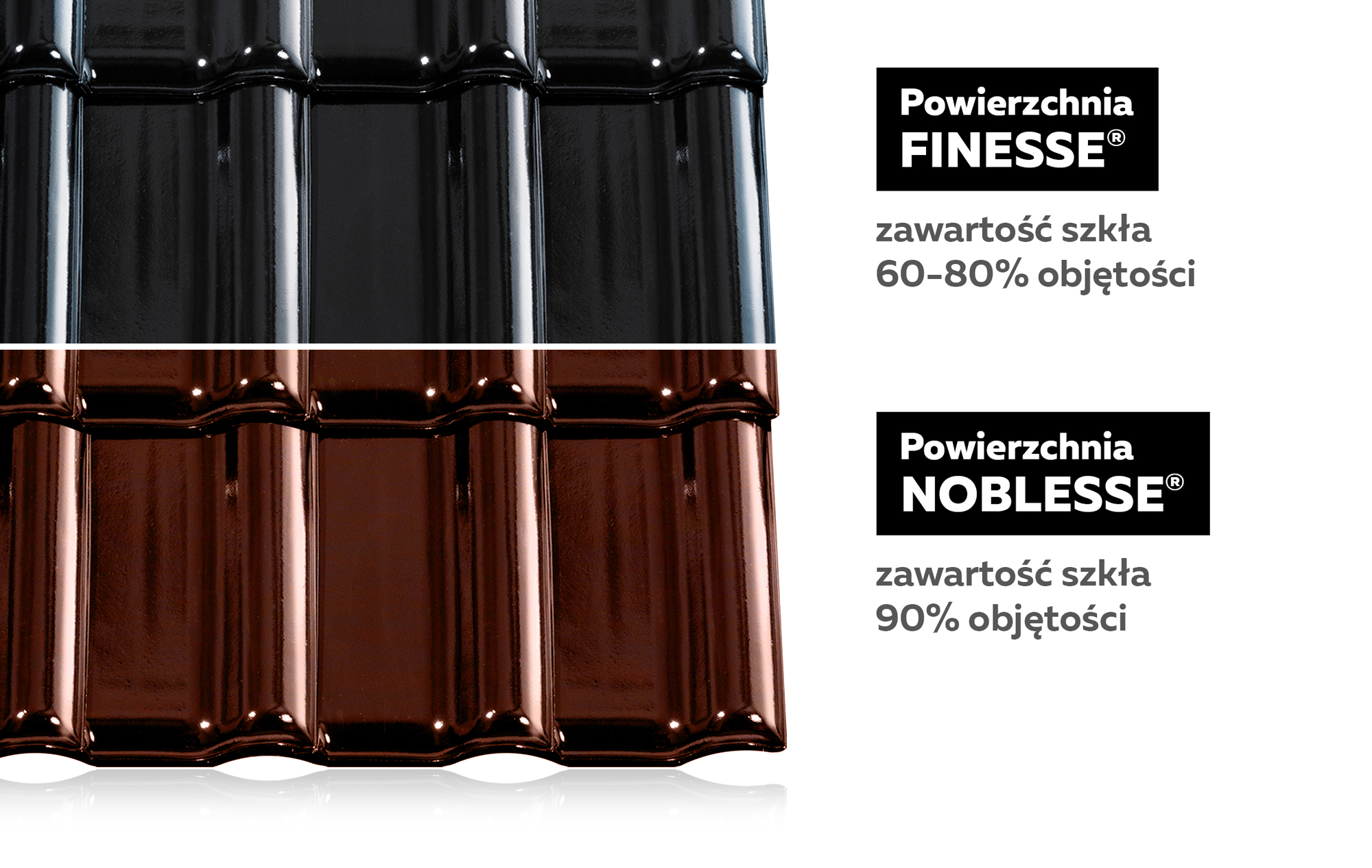 CREATON Polska oferuje dwa rodzaje tej powierzchni na swoich dachówkach ceramicznych – FINESSE i NOBLESSE. Każda z nich składa się z tych samych składników: mielonej gliny, mielonego wstępnie stopionego szkła oraz pigmentów nadających kolor. Obie powłoki różnią się jednak ilością szkła w swoim składzie. W mieszaninie NOBLESSE szkła jest znacznie więcej, nawet 90% objętości, co wpływa na większą ilość światła odbijającego się od powierzchni. W przypadku dachówki ceramicznej TITANIA kolor ten również cechuje widoczna marmurkowatość powierzchni.