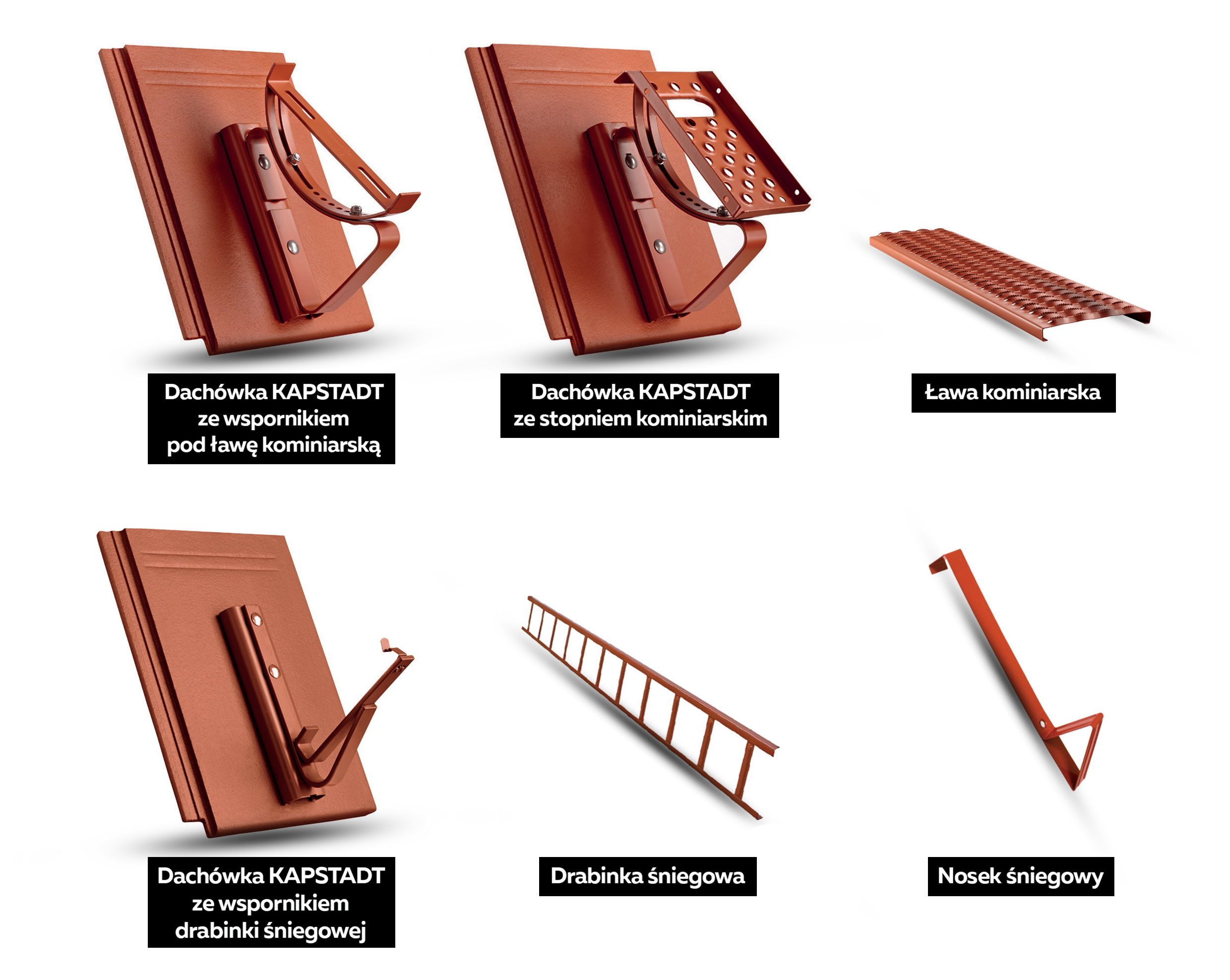 - Dachówki ze wspornikami dla drabinki śniegowej wraz z drabinkami śniegowymi są jednym z popularniejszych rodzajów zabezpieczeń. Da się je wykorzystać na każdym rodzaju dachu, a dzięki możliwości wyboru wariantu długości mogą zostać dopasowane do rozmiaru połaci.