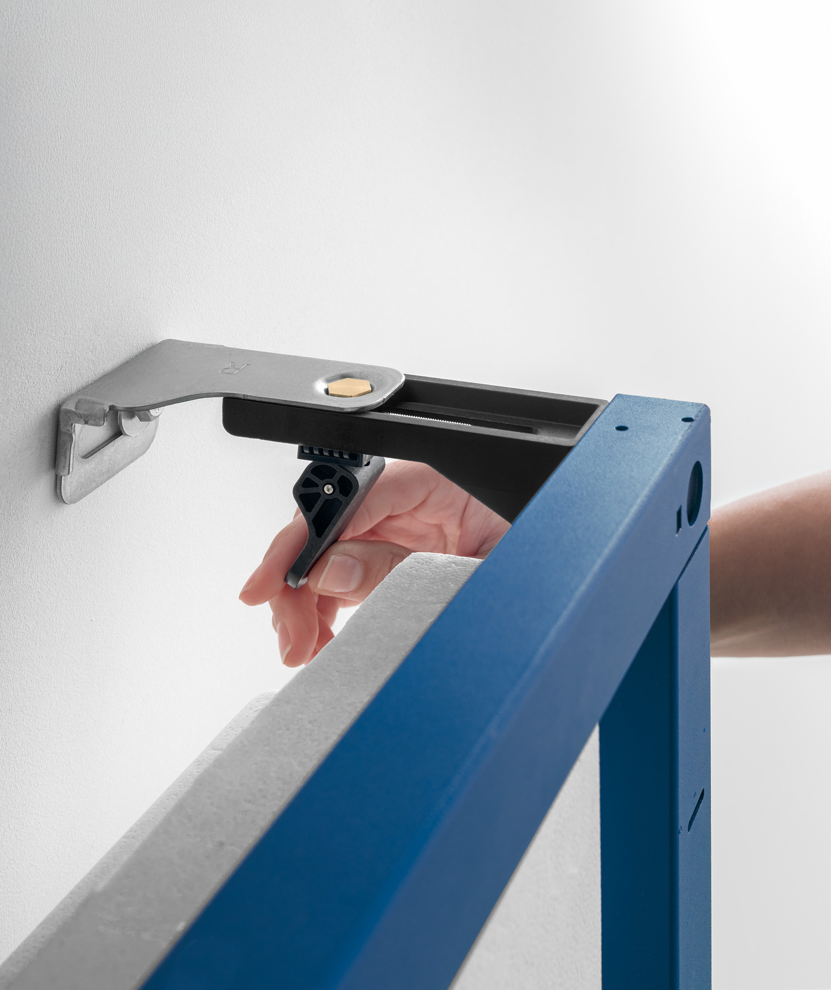 Umieszczone w nogach hamulce stabilizują stelaż jeszcze przed jego trwałym zakotwieniem. Dzięki temu łatwo ustawisz go w odpowiedniej pozycji montażowej. Stelaż będzie stabilnie stał, a Ty masz wolne ręce i możesz spokojnie dopasować mocowania ścienne, ustawić wysokość i wypoziomować konstrukcję.