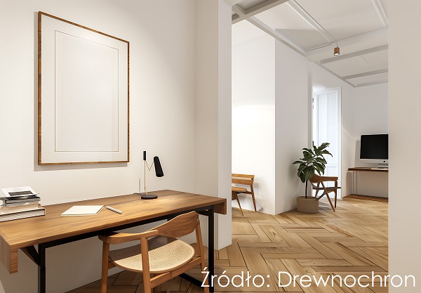 Wyeksponowany lakierem naturalny rysunek drewna sprawia, że podłoga może być nie tylko tłem, ale też kluczowym elementem wystroju minimalistycznego wnętrza. Ciepły odcień parkietu pokrytego Lakierem Drewnochron Parkiet Express harmonizuje z białymi ścianami i sufitami. Przestronne wnętrze nawet przy oszczędnych dekoracjach nie wydaje się puste. Ozdobna jodła wprowadza ton przytulnej elegancji, wdzięcznie komponując się z nowoczesnym umeblowaniem i dyskretnym oświetleniem.